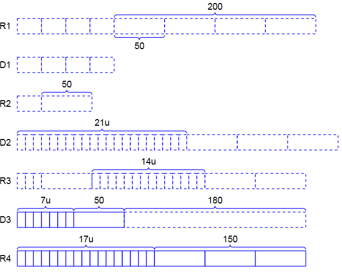add bar title='R1' as r1 add bar title='D1' as d1 add box to r1 add box to d1 r1 - d1 = 200 cut box[1] from right size=200 add label title="200" position=above to r1[2] cut each of r1[1 to 2] into 4 add label title="50" position=below to r1[5] cut d1 into 4 add bar title='R2' as r2 add bar title='D2' as d2 shift r1[1] to r2 shift r1[5] to r2 add label title="50" position=above to r2[2] shift d1[1 to 4] to d2 shift r1[2 to 4] to d2 shift r1[6 to 8] to d2 cut each of d2[1 to 7] into 3 add label title="21u" position=above to d2[1 to 21] add bar title='R3' as r3 add bar title='D3' as d3 shift r2[1 to 2] to r3 cut r3[1] into 3 shift d2[1 to 14] to r3 shift d2[22 to 23] to r3 add label title="14u" position=above to r3[5 to 18] shift d2[15 to 21] to d3 shift d2[24] to d3 add label title="7u" position=above to d3[1 to 7] add label title=50 position=above to d3[8] add box size=180 stroke-style=dashed to d3 with label title="180" position=above r3 = d3 add bar title='R4' as r4 shift r3[1 to 3] to r4 shift r3[5 to 18] to r4 shift r3[4] to r4 shift r3[19 to 20] to r4 add label title="17u" position=above to r4[1 to 17] add label title=150 position=above to r4[18 to 20]