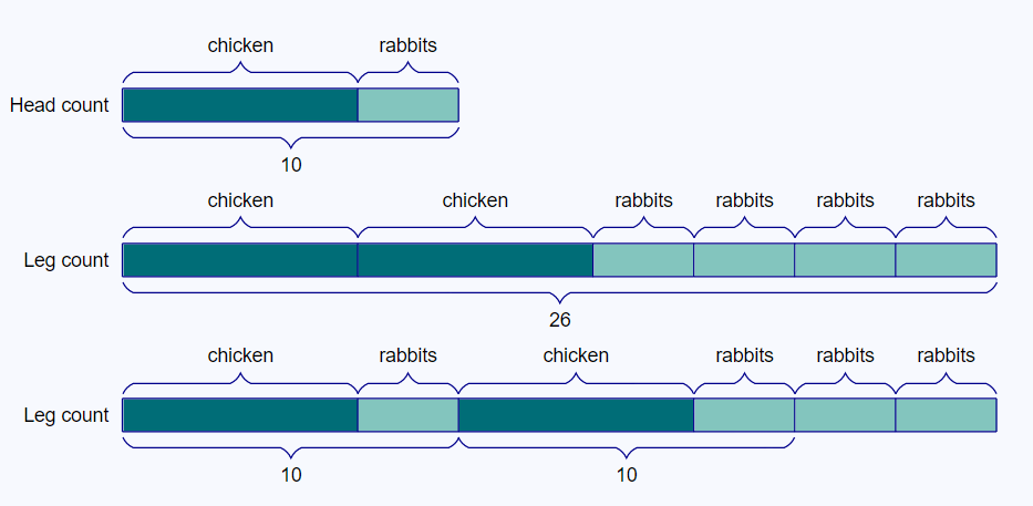 represents the number of rabbits. The first bar shows that the number of chickens plus the number of rabbits equals 10. The second bar shows that each chicken has 2 legs and each rabbit has 4 legs, and the total number of legs is 26. Since we know that the number that